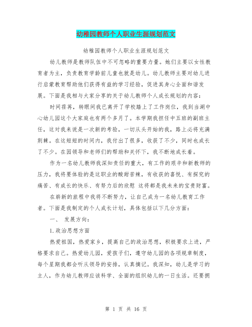 幼稚园教师个人职业生涯规划范文