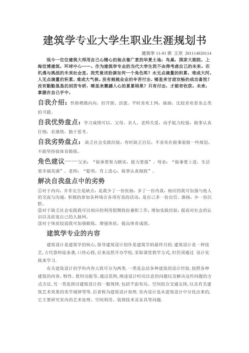 建筑学专业大学生职业生涯规划书-王欢