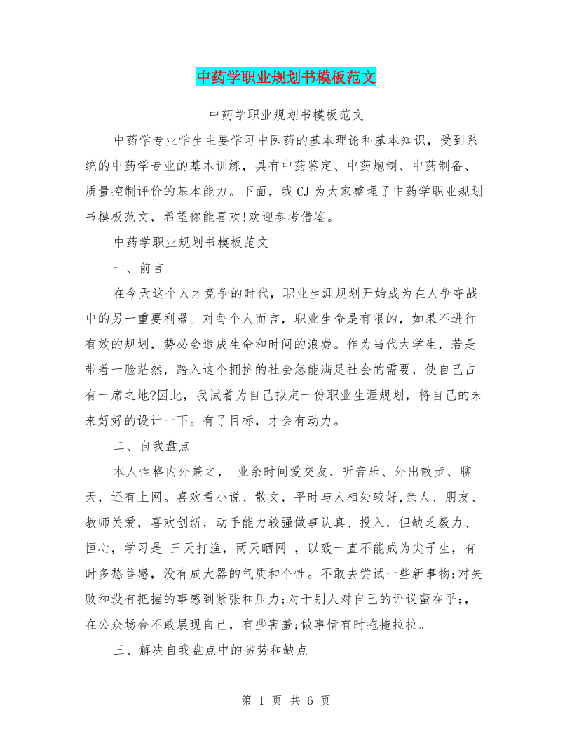 中药学职业规划书模板范文