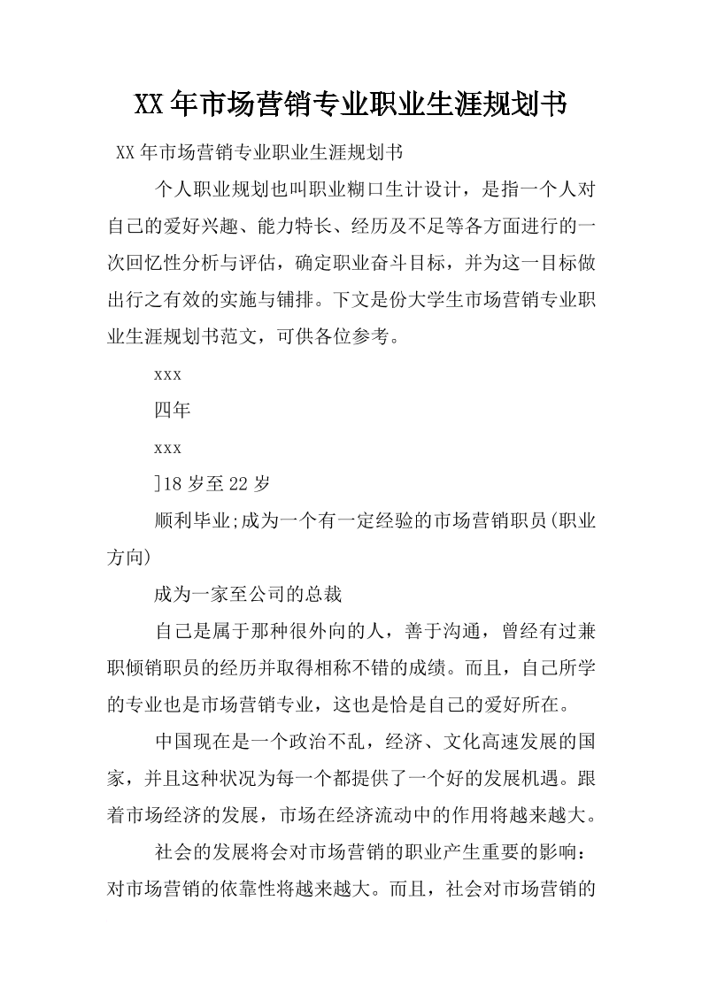 XX年市场营销专业职业生涯规划书