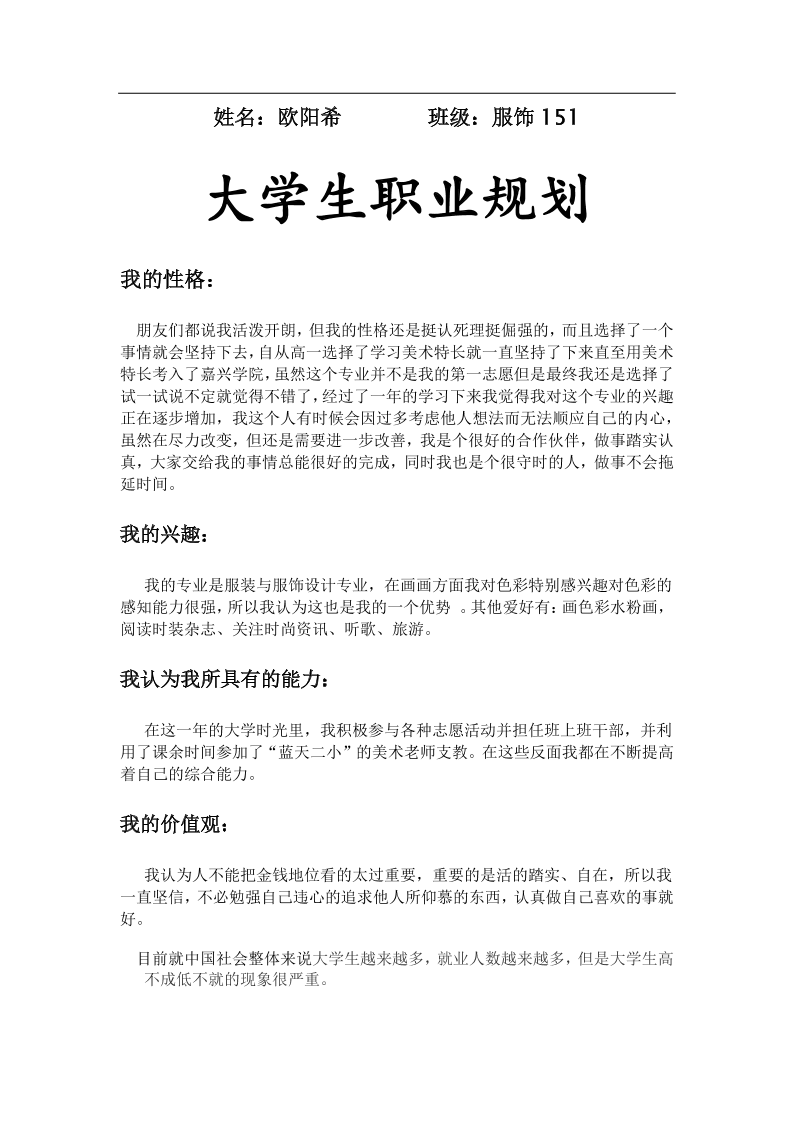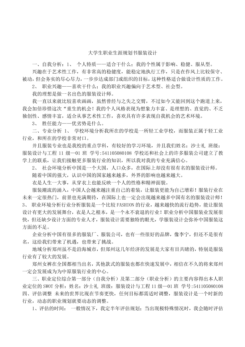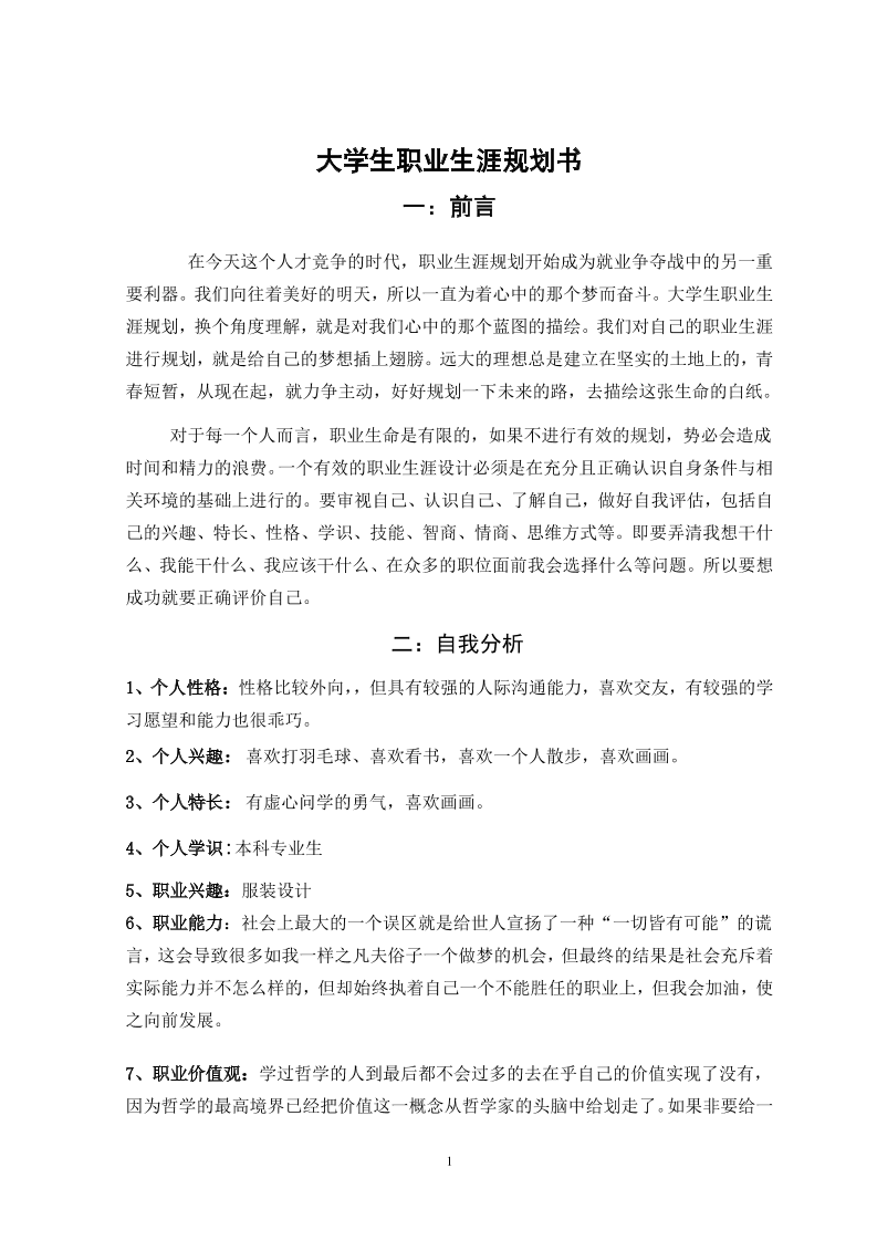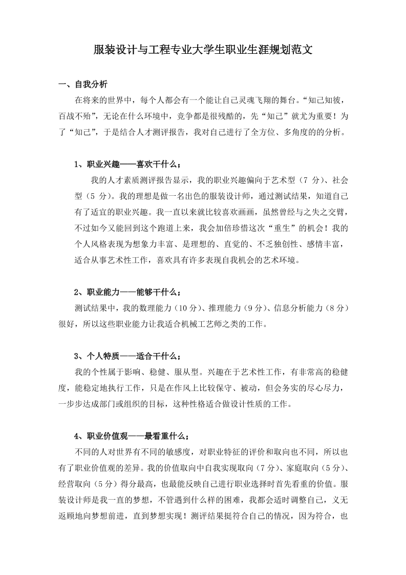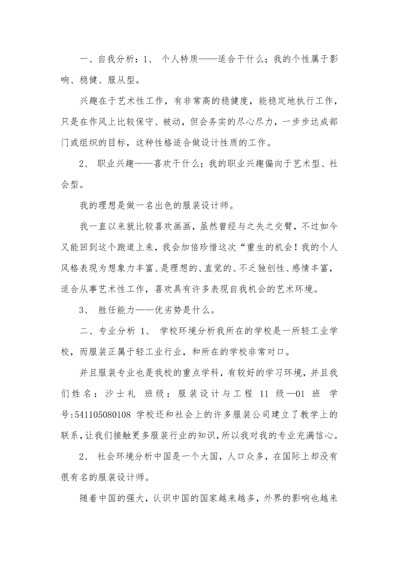 大学生职业生涯规划书服装设计2