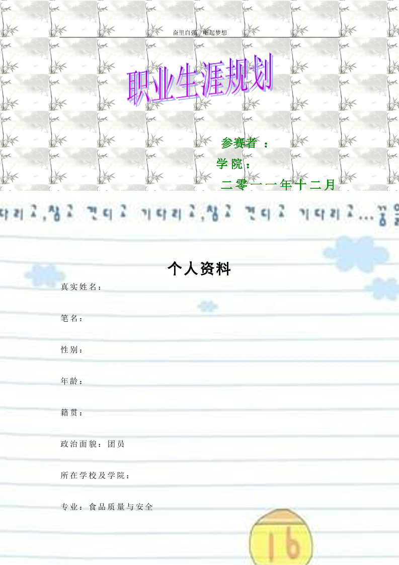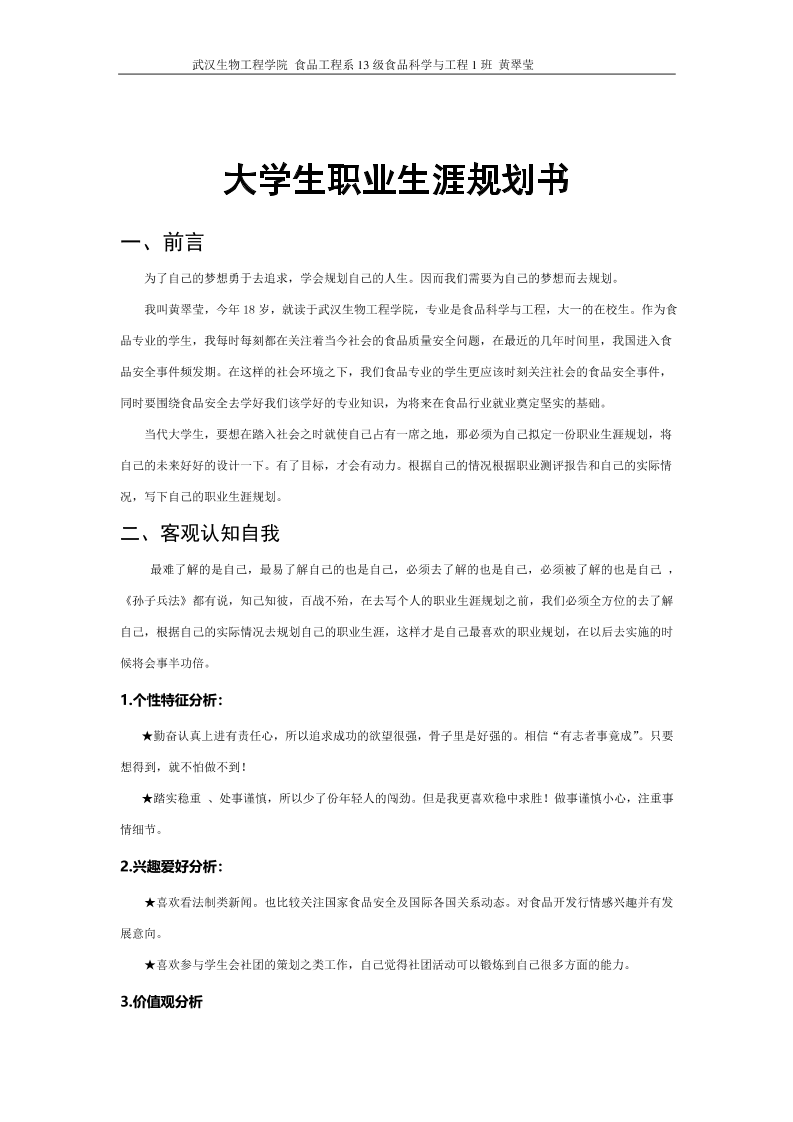 模版参考-食品某同学职业生涯规划书(不能照抄内容-可参考版式)