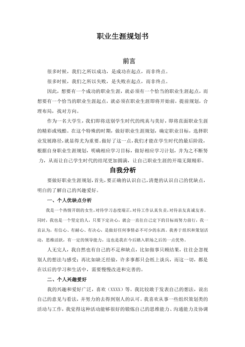 职业生涯规划书模版Word文档