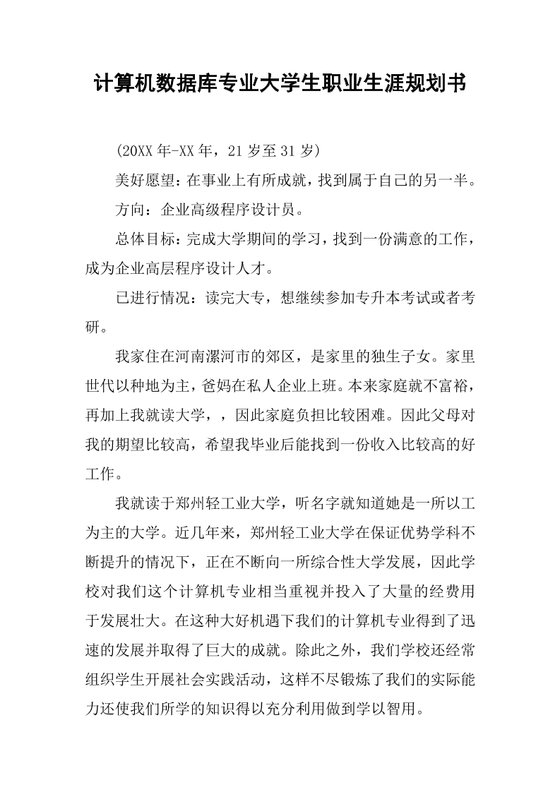 计算机数据库专业大学生职业生涯规划书